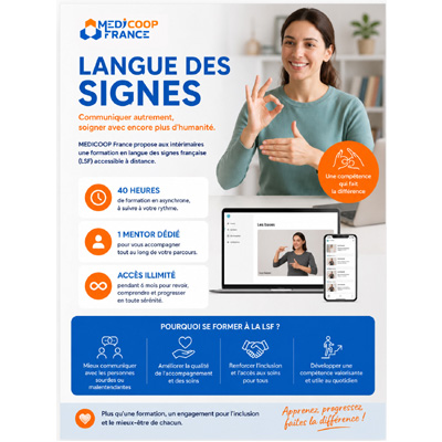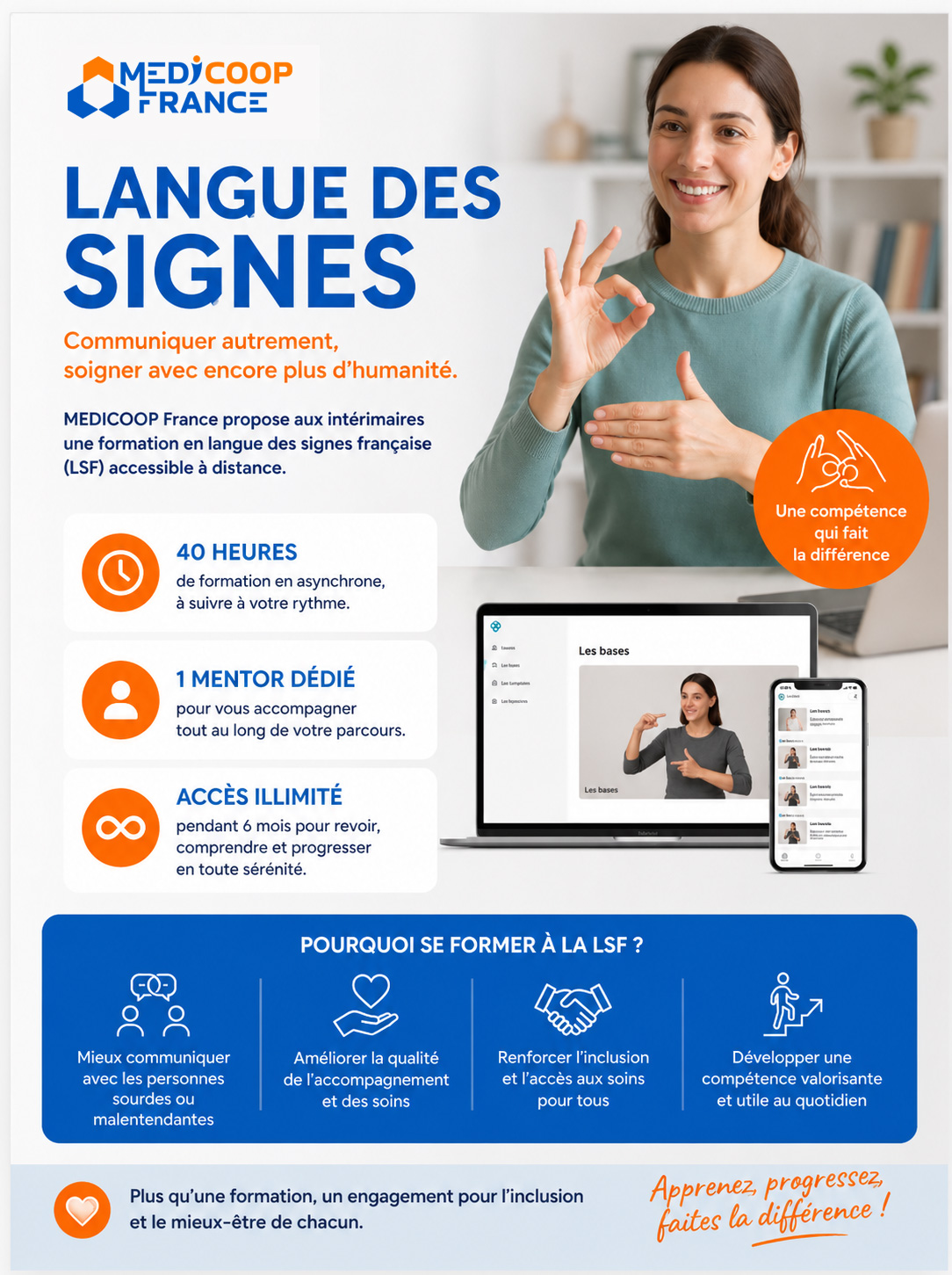 L’Institut de Formation MEDICOOP France propose à nos intérimaires une formation en langue des signes française (LSF), accessible à distance et adaptée à leurs contraintes professionnelles.